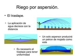 El documento describe los conceptos básicos del riego por aspersión, incluyendo el traslape necesario entre aspersores para lograr uniformidad de riego. Explica el cálculo del horario de riego y los principales componentes del balance hídrico del suelo como infiltración, evaporación y percolación. Finalmente, resume que el objetivo del riego es aplicar el agua de forma intermitente igualando el consumo continuo de la planta, maximizando el ahorro de agua, energía y mano de obra con la mejor uniformidad