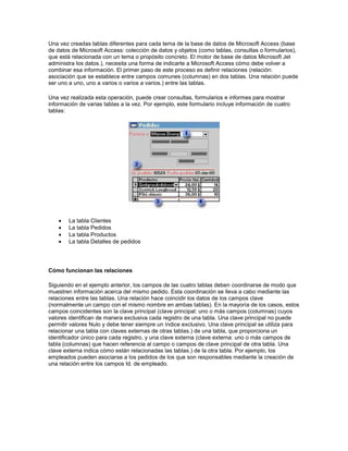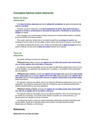Este documento describe los conceptos básicos de las relaciones en bases de datos relacionales, incluyendo los tipos de relaciones (uno a uno, uno a varios, varios a varios), cómo se definen las relaciones, y cómo se aplica la integridad referencial para mantener la coherencia de los datos entre tablas relacionadas.