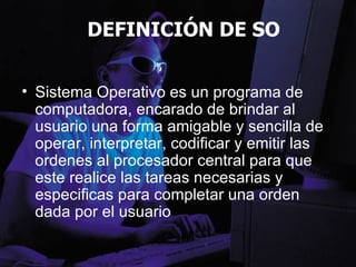 El documento describe los sistemas operativos, definiéndolos como programas que facilitan la interacción entre el usuario y el hardware de una computadora. Explica que los objetivos principales de los sistemas operativos son proporcionar un ambiente de trabajo conveniente, usar los recursos de hardware de manera eficiente y administrar adecuadamente la distribución de recursos. Además, describe las características, funciones, tipos, interfaces y estructura básica de los sistemas operativos.