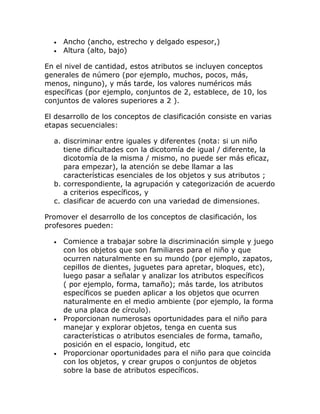 Este documento describe los conceptos básicos que los estudiantes deben comprender para tener éxito con los conceptos matemáticos formales. Estos incluyen la clasificación, la seriación, la conservación y la correspondencia uno-a-uno. Explica que los estudiantes primero deben desarrollar una comprensión de estos conceptos usando objetos reales antes de aplicarlos a cantidades y números. También proporciona ejemplos de actividades que los maestros pueden usar para enseñar estos conceptos fundamentales.