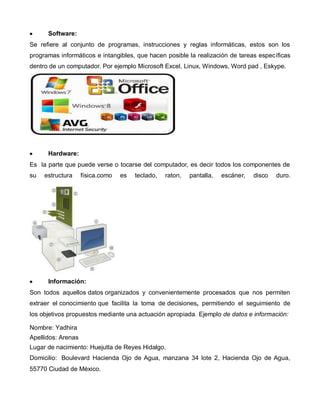 La computación estudia los sistemas de las computadoras, la informática estudia el tratamiento automático de la información en computadoras y sistemas informáticos, basándose en ciencias como las matemáticas y la física. Una computadora es una máquina electrónica que puede recibir, procesar y devolver datos a través de cálculos controlados por programas. El software son los programas e instrucciones que permiten realizar tareas específicas, mientras que el hardware son los componentes físicos de una computadora como el teclado y la