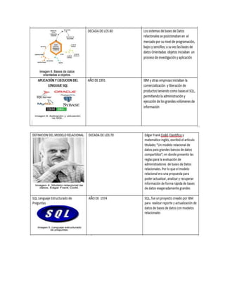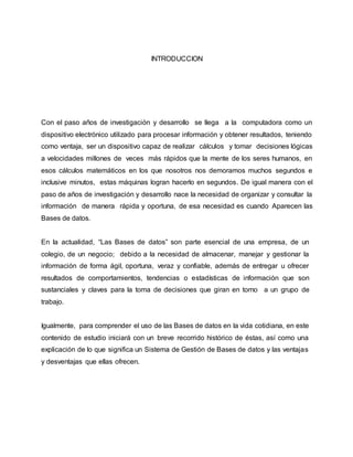 Este documento presenta una introducción a los conceptos básicos de bases de datos y sistemas de gestión de bases de datos. Explica brevemente la historia y evolución de las bases de datos, definiendo conceptos como datos, información y bases de datos. También describe los componentes de una base de datos, características de los sistemas de gestión de bases de datos y sus funciones. Finalmente, introduce conceptos como los niveles de abstracción y funciones del administrador de bases de datos.