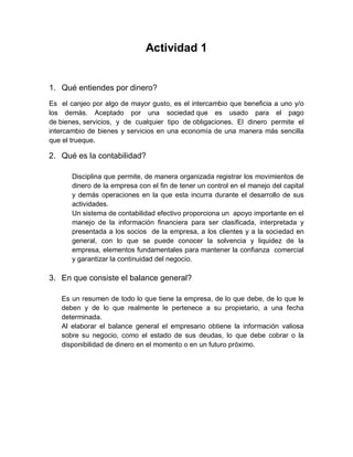 Este documento define conceptos básicos de contabilidad como dinero, contabilidad, balance general, activos, pasivos y patrimonio. Explica que la contabilidad permite registrar de manera organizada los movimientos financieros de una empresa para controlar su capital y operaciones. El balance general resume los activos, pasivos y patrimonio de una empresa a una fecha determinada. Los activos son los bienes y valores de la empresa, mientras que los pasivos son sus deudas. El patrimonio es la diferencia entre activos y pasivos. También define un asiento contable como la an