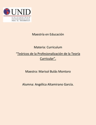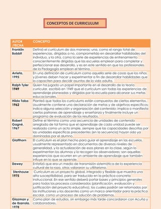 Este documento presenta las definiciones de currículum de varios teóricos a lo largo de la historia. Algunos definen el currículum como las experiencias de aprendizaje planeadas por la escuela, mientras que otros lo ven como un proceso dinámico que se adapta al cambio social. En general, los teóricos coinciden en que el currículum incluye objetivos, contenidos, métodos de enseñanza y evaluación, pero difieren en sus énfasis y detalles sobre estos componentes.
