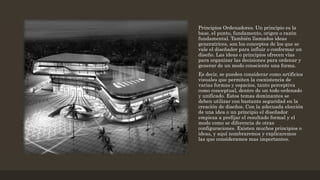El documento presenta principios de diseño en arquitectura, que son conceptos fundamentales que guían la creación y organización de un diseño. Destaca la importancia de principios como simetría, jerarquía, ritmo y unidad, que permiten estructurar visualmente los elementos de un espacio. También se abordan aspectos como equilibrio, armonía y contraste, que son esenciales para lograr composiciones estéticamente agradables y funcionales.