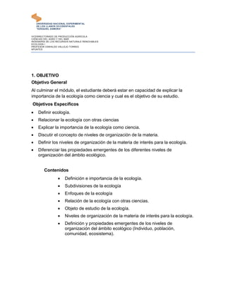 Este documento presenta una introducción al módulo 1 de la asignatura Ecología I. Explica que la ecología es el estudio científico de las interacciones entre los organismos y su ambiente. Describe las diferentes subdivisiones de la ecología como la autoecología y la sinecología. También define conceptos clave como los factores ambientales abióticos y bióticos, y los diferentes niveles de organización de interés para la ecología como los individuos, poblaciones, comunidades y ecosistemas. El objetivo general es que los estudiantes comp