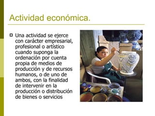 Este documento define y explica varios conceptos económicos fundamentales como actividad económica, demanda, oferta, capital, empresa, precios, producto interno bruto, ingreso nacional, desarrollo y subdesarrollo. Explica que la actividad económica implica la producción o distribución de bienes y servicios, y que la demanda y la oferta dependen del precio y otros factores. También define el capital, la empresa, el producto interno bruto y otros indicadores económicos clave.