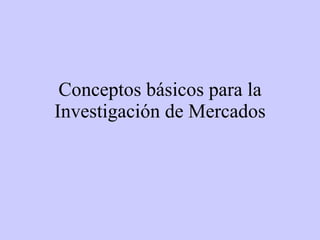 El documento presenta conceptos básicos sobre investigación de mercados. Explica que la investigación de mercados es un proceso científico que permite obtener nuevos conocimientos sobre una situación de mercado para diagnosticar necesidades y problemas y aplicar soluciones. Define los elementos del mercado como compradores, vendedores y precios, y clasifica los mercados según el número de compradores y vendedores. Finalmente, detalla los objetivos de la investigación de mercados como satisfacer necesidades sociales y económicas y ayudar en la administración de las empresas.