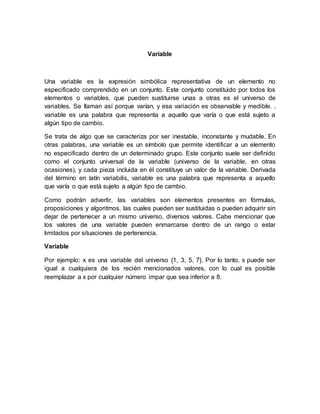 Este documento define conceptos estadísticos básicos como variables, población, muestra, parámetros, estadísticos, escalas de medición, razón, tasa, proporción y diferencias entre estadística descriptiva e inferencial. Explica que una variable representa elementos que pueden cambiar, una población es el conjunto total de elementos a estudiar, y una muestra es una parte de la población. También describe tipos de variables, escalas de medición y estadísticos utilizados para resumir datos.