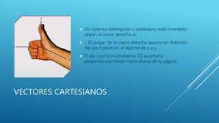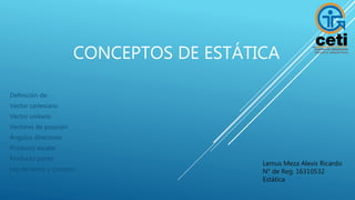 El documento detalla conceptos fundamentales de estática, incluyendo vectores cartesianos, vectores unitarios, y su uso en la definición de posiciones y ángulos directores. Se explica el producto escalar y el producto punto como métodos de multiplicación de vectores, además de las leyes de seno y coseno aplicadas a triángulos. Este contenido es esencial para entender cómo se aplican estas nociones en física y matemáticas.