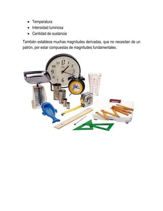 La medición es un proceso básico de la ciencia que consiste en comparar un patrón seleccionado con el objeto o fenómeno a medir para determinar cuántas veces el patrón está contenido en esa magnitud. Una unidad de medida es una cantidad estandarizada de una magnitud física, y los sistemas de unidades establecen las unidades que deben usarse internacionalmente. El Sistema Internacional de Unidades define 7 magnitudes fundamentales con sus patrones de medición y también incluye magnitudes derivadas compuestas de las fundamentales.