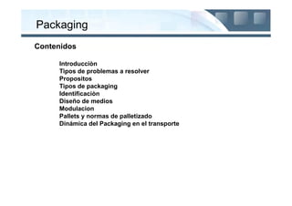 Este documento presenta una introducción a los conceptos de packaging. Explica que el packaging protege productos durante su distribución, almacenamiento, manipulación, venta y uso, y también se refiere al proceso de diseño y producción de envases. Luego describe los diferentes tipos de problemas que el packaging busca resolver, como la seguridad, el aprovechamiento de espacio y los costos. También cubre los diferentes propósitos del packaging como el marketing, la protección física y la transmisión de información.