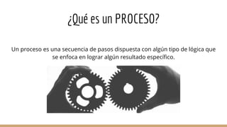 Un proceso es una secuencia de pasos con lógica para lograr un resultado. Los procesos pueden ser clave, estratégicos o de apoyo. La calidad en los procesos requiere una buena relación entre equipos internos como el que prepara reportes y el almacén. Un proceso mide la efectividad del uso de recursos para cumplir resultados.