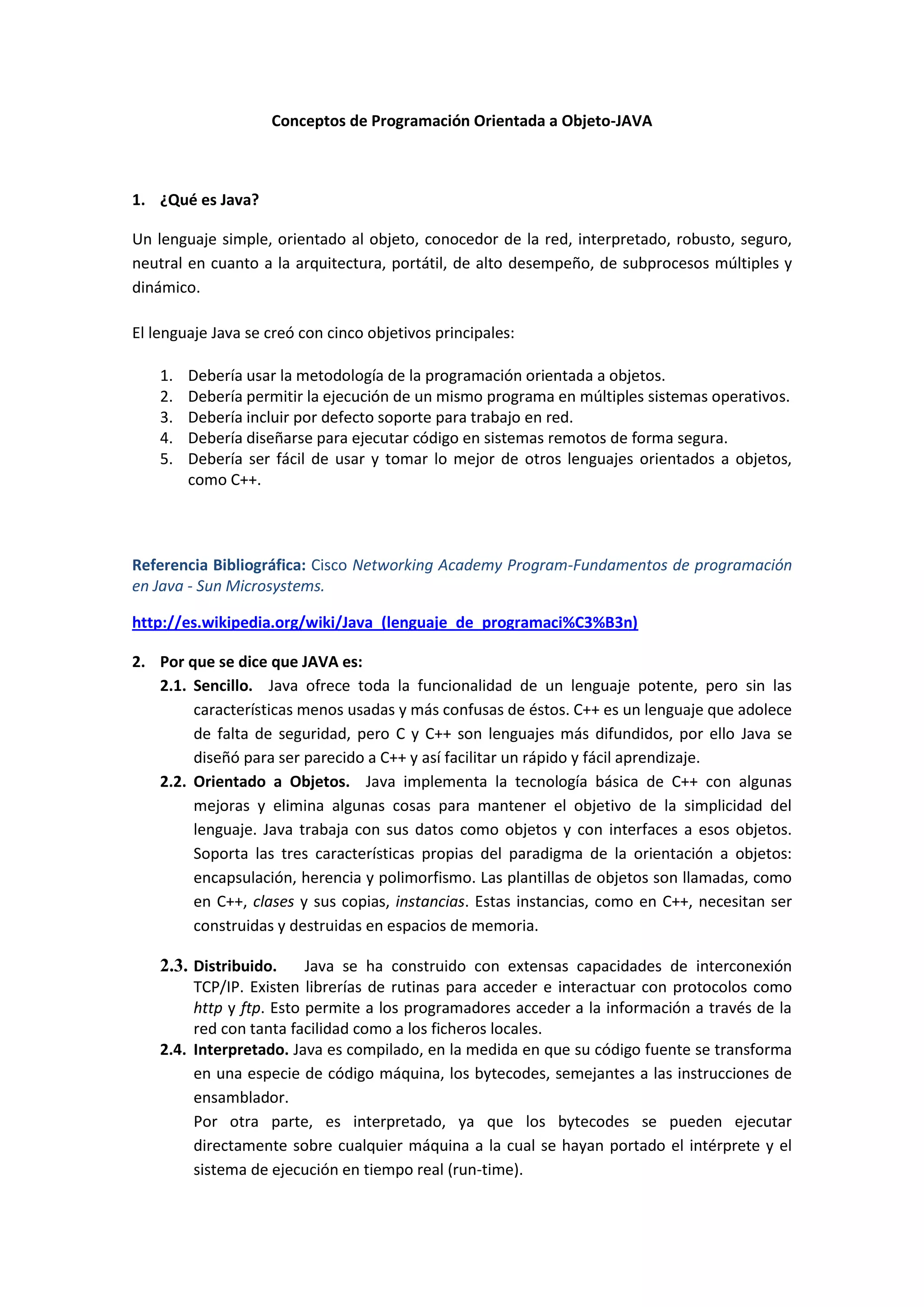 El documento describe los conceptos básicos de la programación orientada a objetos en Java. Explica que Java es un lenguaje simple, orientado a objetos, seguro e interpretado diseñado para ser portable, robusto y de alto rendimiento. También cubre conceptos clave como encapsulamiento, herencia y polimorfismo.