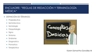 Este documento define los principales términos médicos relacionados con la redacción y terminología médica como propedeutica, semiotecnica, semiología, fisiopatología, signo, síntoma, síndrome, diagnóstico, pronóstico y terapéutica. Explica que la propedeutica clínica es el estudio de los métodos para obtener síntomas y signos para elaborar un diagnóstico, mientras que la semiología se ocupa del estudio de los signos y síntomas de las enfer