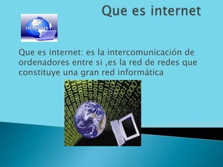 Internet es la interconexión global de redes de computadoras que permite el intercambio de información. Los servidores cumplen funciones clave como almacenar y proveer correo, páginas web, nombres de dominio y más. Los routers permiten la interconexión de redes locales y el enrutamiento eficiente de la información. Las direcciones IP identifican de forma única las máquinas en una red.