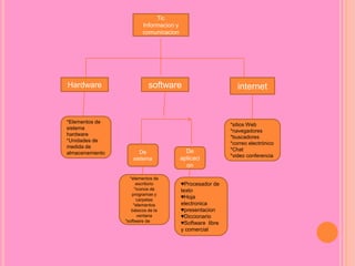 Este documento presenta conceptos básicos sobre Tecnologías de la Información y la Comunicación (TIC), incluyendo hardware, software, internet, navegadores, buscadores, redes sociales, correo electrónico y manipulación de imágenes. Explica elementos como procesadores, memorias, pantallas, teclados y otros componentes de hardware. También define software de sistema, aplicaciones como procesadores de texto y hojas de cálculo. Describe características de internet como intercambio de información entre computadoras y protocolos de comunicación.