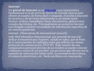 Un portal de Internet es un sitio web que sirve como puerta de entrada para acceder de forma integrada a una variedad de recursos y servicios relacionados con un tema específico, como enlaces, buscadores, foros y aplicaciones. Los navegadores web como Internet Explorer, Firefox y Opera permiten ver páginas web y cuentan con características como pestañas, bloqueo de publicidad, buscadores integrados y personalización a través de extensiones. Una red de computadoras interconecta dispositivos para compartir información y recursos a través