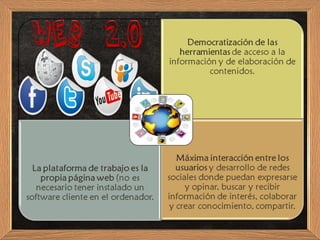 La Web 2.0 se caracteriza por su usabilidad y permitir que los usuarios interactúen y sean productores de información. Promueve el aprendizaje haciendo cosas con la tecnología pero las TIC no tienen efectos mágicos en el aprendizaje, lo importante es el método didáctico y las actividades planificadas.