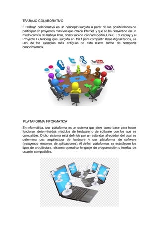 El documento define varios conceptos clave relacionados con la comunicación y las tecnologías de la información. Explica que la comunicación técnica involucra la transmisión de información a través de medios como la escritura y el habla. Define un medio de comunicación como el instrumento o forma de contenido a través del cual ocurre el proceso comunicativo. También describe el trabajo colaborativo, las plataformas informáticas, la red Internet, las páginas web, portales de Internet, las TIC y sus ventajas y desventajas, la import