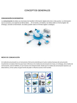 El documento trata sobre varios conceptos relacionados con la informática y la comunicación digital. Explica que la comunicación de datos implica la transferencia de información digital entre puntos, y que los datos pueden estar en formato digital o análogo durante la transmisión. También define conceptos como medio de comunicación, trabajo colaborativo, plataforma informática, red Internet, página web, portal web, redes sociales y más.