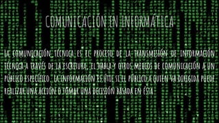 El documento trata sobre conceptos generales de comunicación en informática, incluyendo medios de comunicación, trabajo colaborativo, plataformas informáticas, la red Internet, páginas web, portales web y las tecnologías de la información y comunicación (TIC). Explica que las TIC permiten procesar, administrar y compartir información a través de diversos dispositivos tecnológicos y ofrecen ventajas como beneficios en salud y educación, pero también presentan desventajas como falta de privacidad y aislamiento. Resal