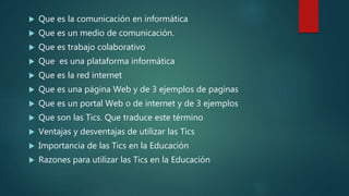 El documento aborda conceptos clave sobre mantenimiento de equipos, comunicación en informática, trabajo colaborativo, y la importancia de las tecnologías de la información y la comunicación (TIC) en la educación. Se discuten las ventajas y desventajas de las TIC, así como su impacto en el aprendizaje y la interacción entre estudiantes y profesores. Además, se explican los tipos de plataformas informáticas, páginas web, y portales de internet, proporcionando ejemplos concretos.