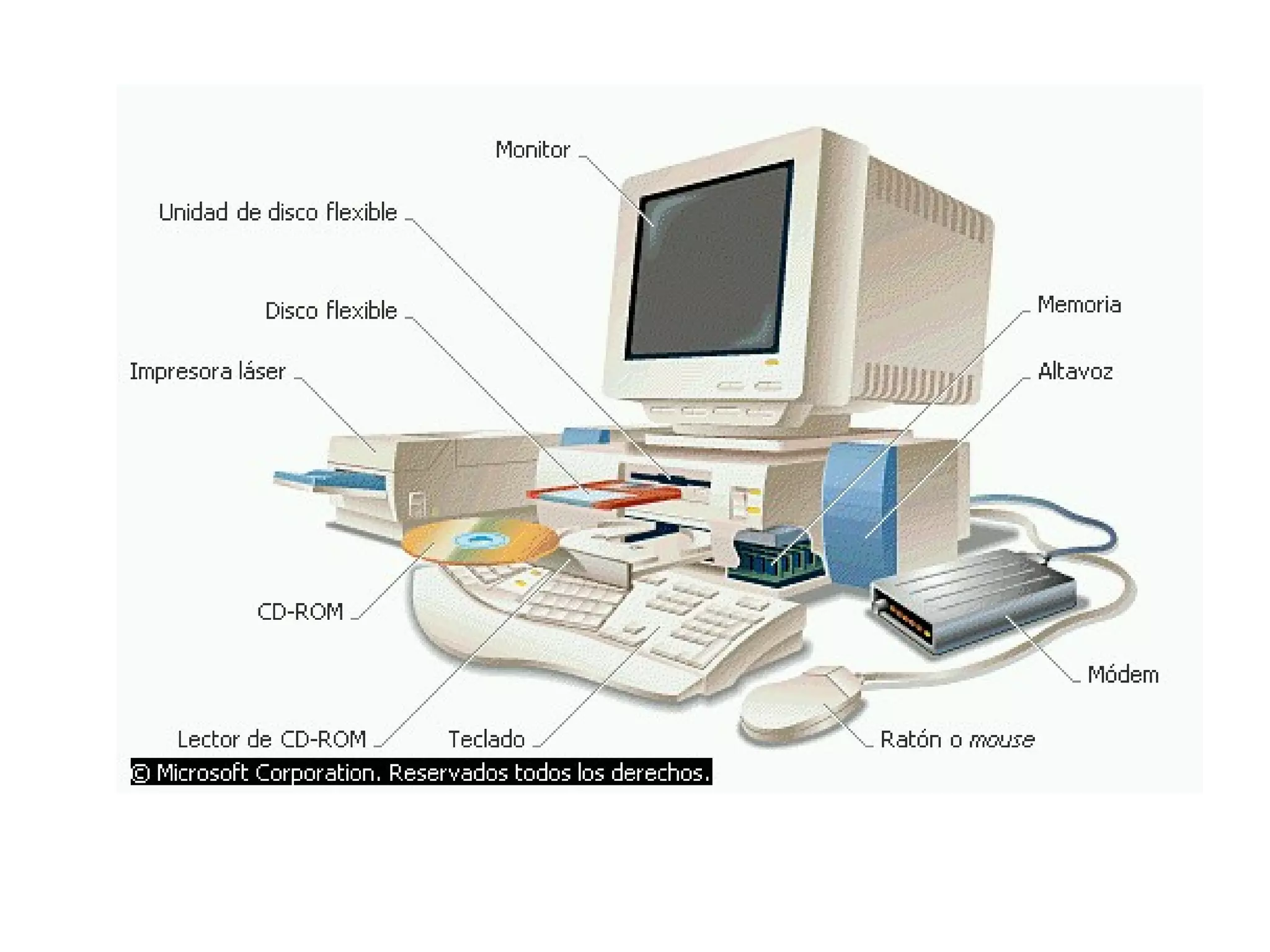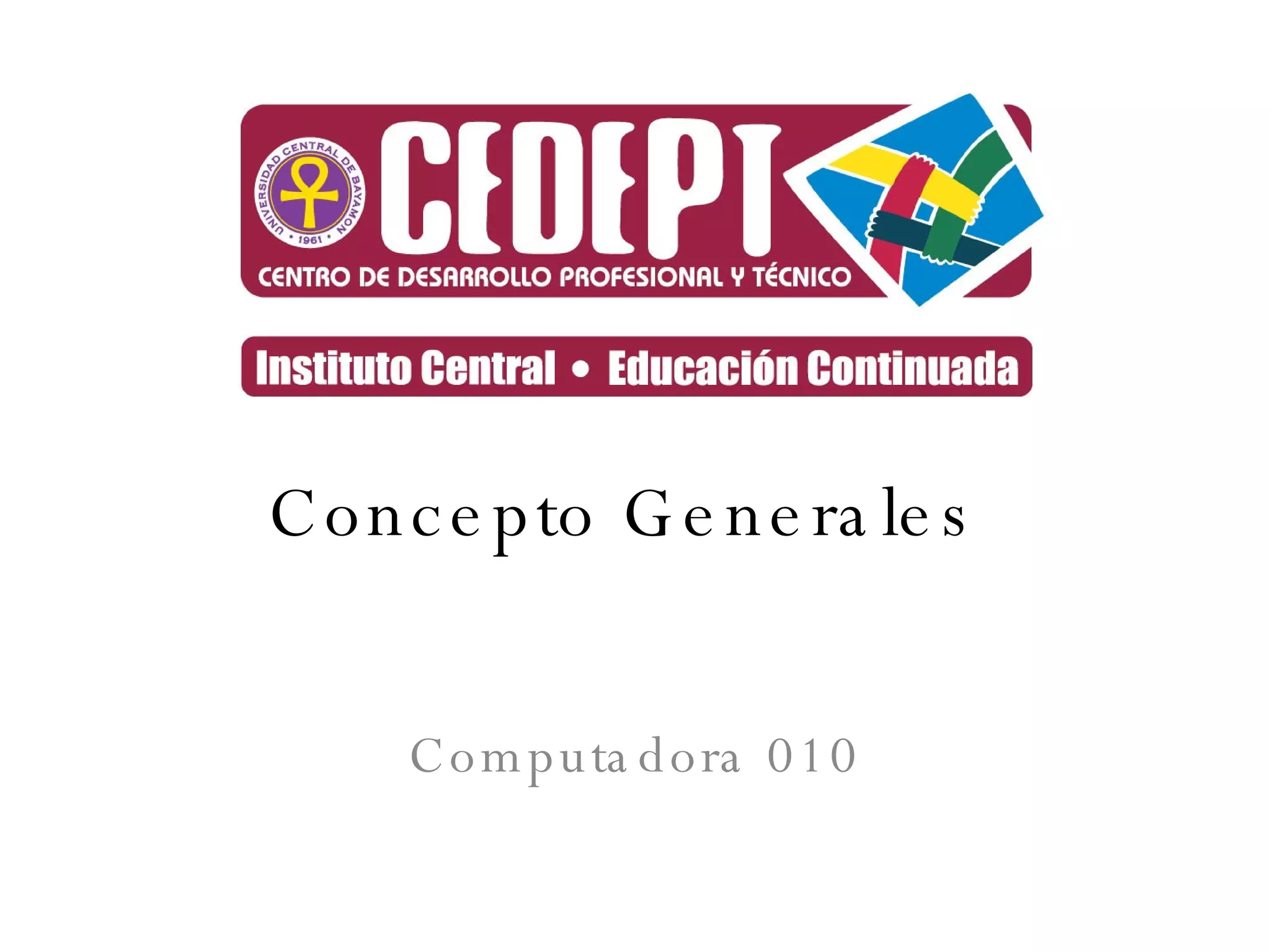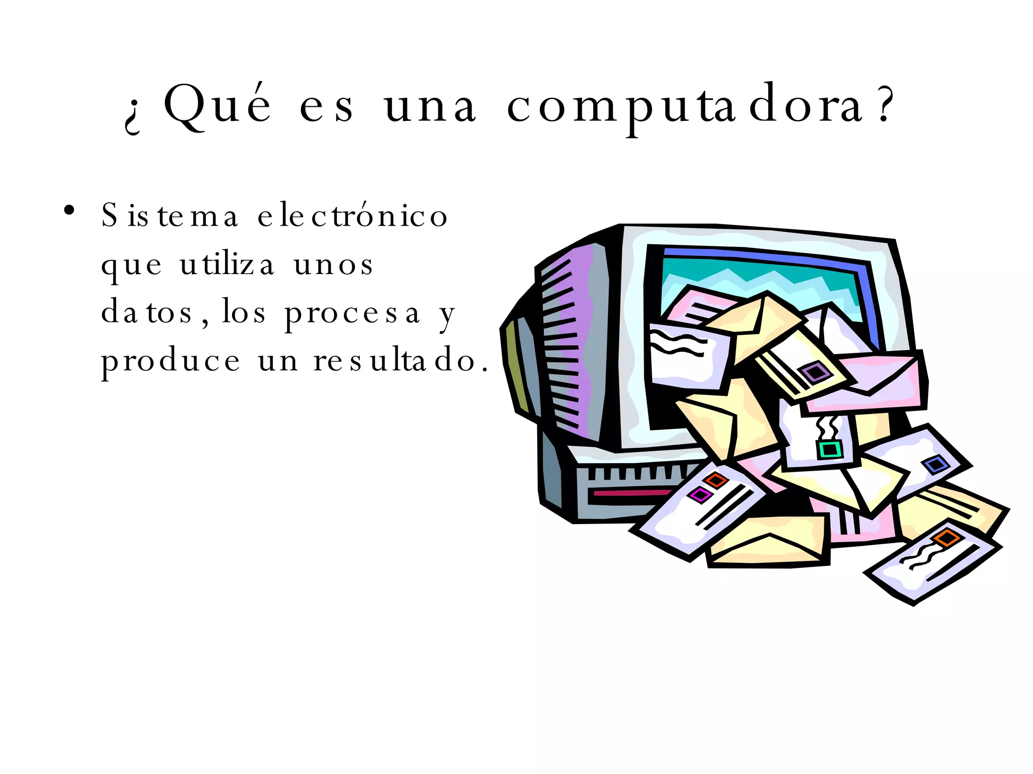 Un computadora es un sistema electrónico que utiliza datos, los procesa y produce un resultado. Está compuesta de hardware (componentes físicos) y software (programas). Elementos claves incluyen la CPU, memoria RAM y ROM, y dispositivos de entrada/salida. El sistema operativo controla los procesos y permite la interacción con el hardware y software.