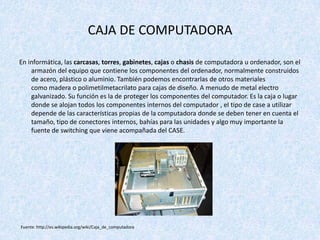 El documento describe los diferentes tipos de cajas o gabinetes para computadoras, incluyendo su tamaño, materiales de construcción y funciones. Explica que las cajas protegen los componentes internos y deben tener ventilación adecuada. También menciona factores a considerar al elegir una caja como el tamaño de la placa base, espacio disponible y tipo de fuente de energía. Finalmente, detalla varios tipos de conectores comunes como USB, HDMI, VGA y puertos PCI.