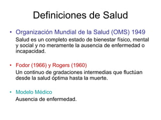 Este documento define la salud de acuerdo a la OMS como un estado completo de bienestar físico, mental y social, no solo la ausencia de enfermedad. Explica que la salud holística considera las dimensiones mentales, sociales, emocionales, físicas y espirituales de forma interdependiente. También describe los cinco componentes de la salud - física, mental, emocional, social y espiritual - y señala que no hay salud si una dimensión no está saludable. Finalmente, indica que el est