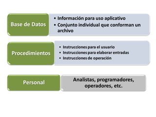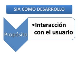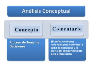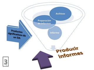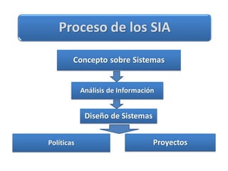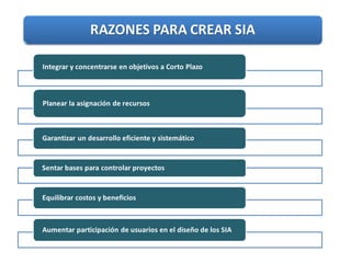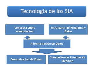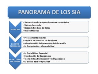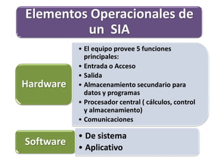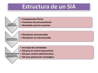 Este documento describe los elementos de un Sistema de Información Administrativa (SIA) y su funcionamiento. Un SIA se describe como una estructura piramidal que consta de tres niveles: el nivel superior recopila y procesa datos, el nivel intermedio almacena y gestiona transacciones, y el nivel inferior contiene los archivos maestros y de transacciones. El documento también cubre los tipos y usos de SIA, incluyendo su uso para dirigir operaciones, reportar información y tomar decisiones.