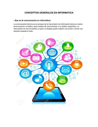Este documento proporciona definiciones de varios conceptos básicos de informática como comunicación técnica, medios de comunicación, trabajo colaborativo, plataformas informáticas, Internet, páginas web, portales web, TIC, redes sociales y sus componentes. También describe ventajas y desventajas de las TIC y la importancia de las TIC en la educación. Las redes sociales más populares actualmente son Facebook, que permite compartir información con amigos y familiares, y Twitter, que limita los mensajes a 280 caracteres y permite comunic
