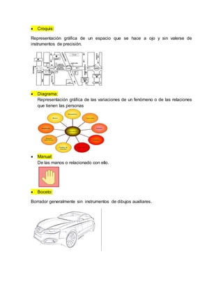 Este documento define varios tipos de representación gráfica como dibujos, croquis, diagramas y esquemas. Explica que la representación muestra algo de forma simbólica o imitativa, y que la perspectiva representa objetos en una superficie plana para dar una idea de su posición. También define conceptos como acotación, escala, símbolo, esbozo, pictograma e ideograma.
