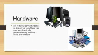El documento define conceptos informáticos básicos como hardware, software, internet, intranet, sistema operativo, red, topología de red. Explica que el hardware son las partes físicas de un dispositivo y el software lo intangible que permite que funcione. También describe a internet como una red global que comparte información pública y una intranet como una red privada dentro de una organización. Finalmente, concluye que el hardware y software se necesitan mutuamente para satisfacer las necesidades de los usuarios.