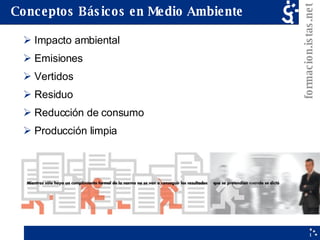 El documento describe los conceptos básicos de medio ambiente e impacto ambiental. Explica que el impacto ambiental de las empresas se debe a las emisiones, vertidos, residuos generados, uso excesivo de recursos y sustancias peligrosas. Las emisiones a la atmósfera causan el cambio climático y daño a la capa de ozono, mientras que los vertidos contaminan ríos, mares y aguas subterráneas. Los residuos producidos por el ser humano no se reciclan adecuadamente. La mejor forma de ab