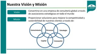 Valio Competitive Intelligence Ibero-América SAS es una empresa de consultoría enfocada en mejorar la competitividad y sostenibilidad de sus clientes mediante soluciones estratégicas y una variedad de servicios como asesoría en gestión empresarial, análisis de mercado y planificación estratégica. Su filosofía se basa en alianzas sólidas, compromiso y ética, y su misión es convertirse en un socio global a través de la innovación y la gestión del conocimiento. Ofrecen herramientas para la toma de decisiones, desarrollo de proyectos y estudios sobre competitividad global, adaptándose a las necesidades de sus clientes.