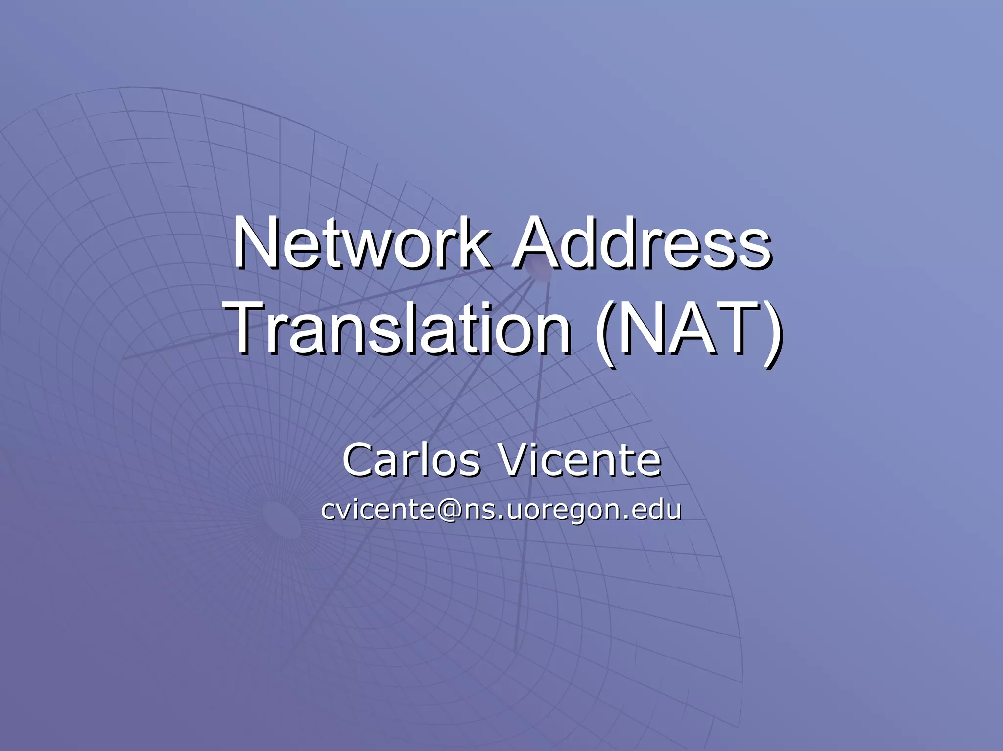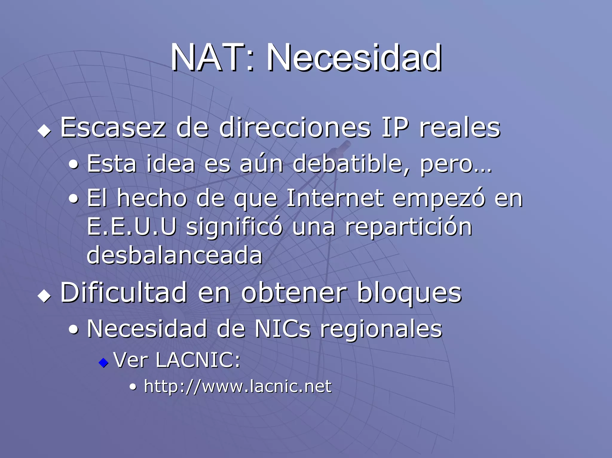 Network Address Translation (NAT) permite a las redes privadas usar direcciones IP privadas al traducirlas a direcciones públicas cuando se comunican con recursos externos. Esto ayuda a aliviar la escasez de direcciones IP públicas y mejora la seguridad al ocultar la topología interna. NAT funciona traduciendo las direcciones IP y, a veces, los puertos en la comunicación entre redes internas y externas. Sin embargo, NAT también presenta limitaciones para algunos protocolos y cuando los paquetes están cifrados.