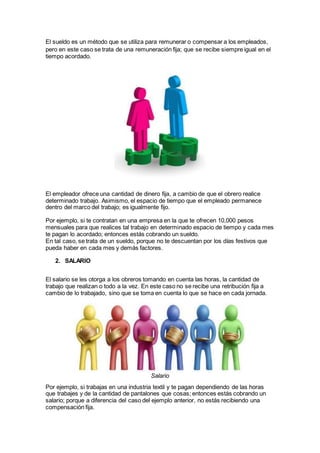 Este documento describe diferentes conceptos remunerativos como el sueldo, salario, utilidades, gratificaciones, bonificaciones, comisiones y tiempo extra. El sueldo es una remuneración fija mensual mientras que el salario depende de las horas trabajadas. Las utilidades son ingresos adicionales para los trabajadores basados en las ganancias de la empresa. Las gratificaciones son pagos adicionales en fechas festivas como Navidad.