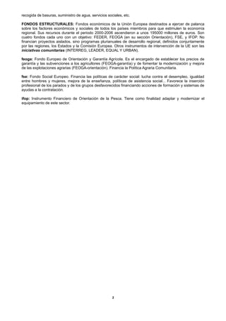 Este documento resume varios conceptos clave relacionados con el desarrollo rural en Europa y España. Explica los fondos de la Unión Europea destinados a proyectos de desarrollo rural como el FEADER, LEADER y PRODER. También define términos como comarca, desarrollo endógeno, desarrollo rural sostenible y Grupo de Acción Local, que son entidades clave en la promoción del desarrollo económico y social de las zonas rurales.