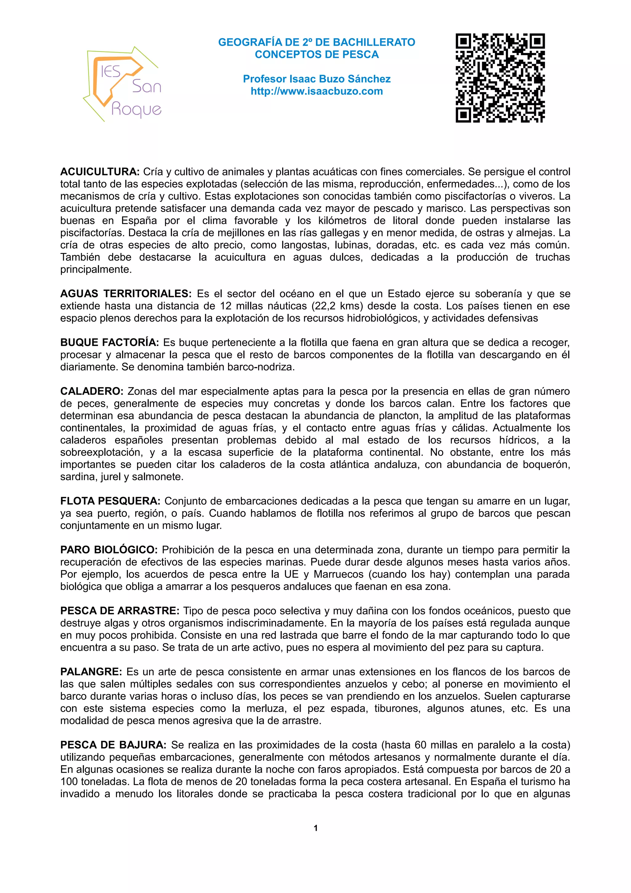 Este documento proporciona información sobre varios conceptos relacionados con la pesca, incluyendo acuicultura, aguas territoriales, buque factoría, caladero, flota pesquera, paro biológico, pesca de arrastre, palangre, pesca de bajura, pesca de altura y pesca de gran altura. Explica brevemente cada uno de estos términos y conceptos clave relacionados con la industria pesquera.