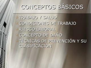 El documento aborda la prevención de riesgos laborales, definiendo conceptos clave como riesgo laboral, daño y sus clasificaciones. Destaca la importancia de las condiciones de trabajo y los factores que pueden causar daño a la salud del trabajador, incluyendo aspectos físicos, químicos y organizacionales. También se mencionan técnicas de prevención y la necesidad de adaptar el ambiente laboral para minimizar estos riesgos.