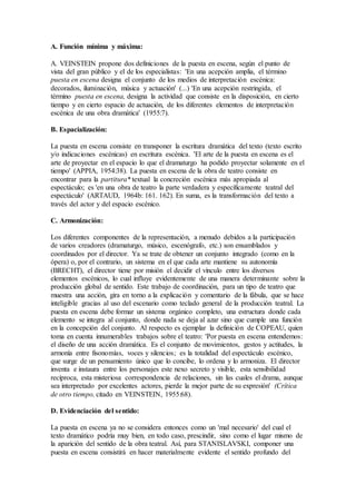 1) El documento describe el proceso de ensayo teatral y cómo involucra a todo el elenco en la preparación de la obra. 2) También discute el concepto más amplio de "trabajo teatral" que incluye no solo ensayos sino también análisis dramático, traducción, improvisación y otros aspectos de la producción. 3) Finalmente, explica que la puesta en escena transforma el texto escrito en una representación escénica a través de la disposición espacial de los actores, la coordinación de los diferentes elementos artí