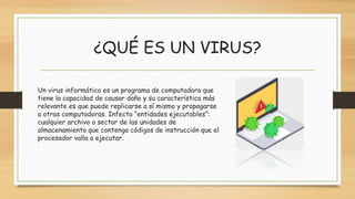 Este documento describe los virus informáticos, incluyendo su definición, tipos, características, cómo funcionan, síntomas de infección, el primer virus y antivirus. Explica que un virus es un programa que se replica a sí mismo y se propaga a otras computadoras, causando daño. Los primeros virus fueron Creeper en 1972 y el primer antivirus fue REAPER en 1973.