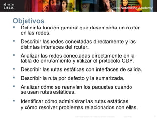 Este documento describe conceptos y protocolos de enrutamiento estático. Explica la función de un router, cómo analizar las interfaces y redes conectadas directamente, y cómo usar rutas estáticas y el protocolo CDP. También cubre cómo configurar rutas estáticas con interfaces de salida, rutas por defecto y sumarizadas, y cómo los paquetes son reenviados usando rutas estáticas.