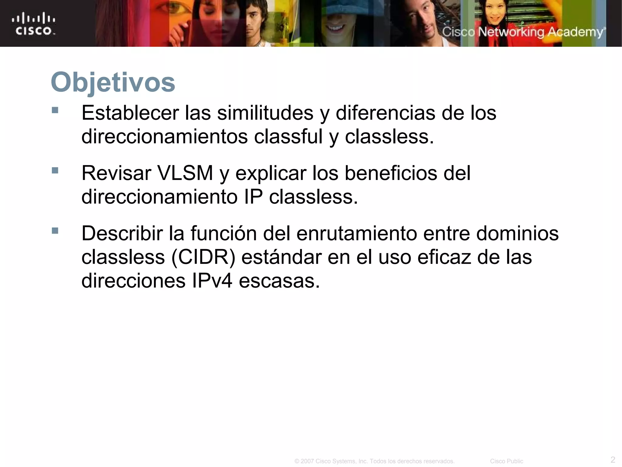 El documento explica las diferencias entre el direccionamiento IP classful y classless. El direccionamiento classful divide las direcciones IP en clases A, B y C dependiendo de los bits más significativos, mientras que el direccionamiento classless usa VLSM y CIDR para usar las direcciones de manera más eficiente mediante el uso de máscaras de subred personalizadas y la sumarización de rutas.