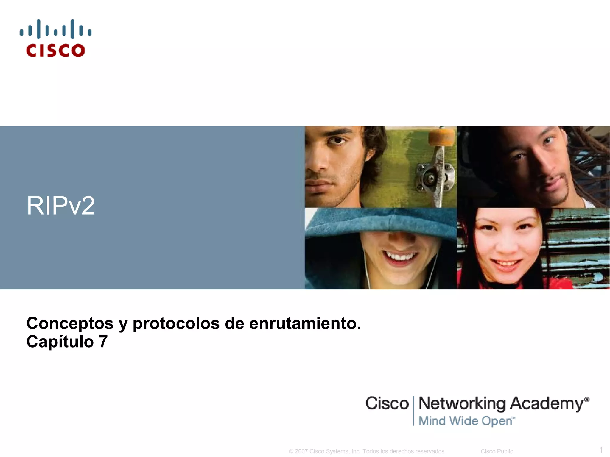 Este documento describe las diferencias entre RIPv1 y RIPv2, incluidas las limitaciones de RIPv1 como su falta de soporte para VLSM y CIDR. Explica cómo configurar RIPv2 en un router Cisco y verificar que proporciona soporte para VLSM y CIDR. También enumera los pasos para verificar y resolver problemas comunes de RIPv2.