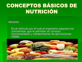 Este documento presenta conceptos básicos de nutrición. Explica que la nutrición es el proceso mediante el cual el cuerpo aprovecha los alimentos ingeridos para obtener energía y nutrientes de los macronutrientes (hidratos de carbono, proteínas y lípidos) y micronutrientes (vitaminas y minerales). También describe los componentes de una dieta balanceada según el Plato del Bien Comer y ofrece consejos para facilitar el consumo de una dieta correcta.