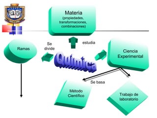 Este documento presenta los conceptos básicos de química. Explica que la materia está compuesta de átomos y moléculas, y puede encontrarse en diferentes estados como sólido, líquido y gas. Describe las propiedades físicas y químicas de la materia, así como los cambios de estado y las transformaciones que puede experimentar, incluyendo los cambios físicos y químicos. También define conceptos como elementos, compuestos, mezclas y reacciones químicas.