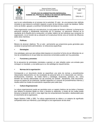 Este documento presenta definiciones y descripciones de varios conceptos y procesos clave relacionados con la administración de empresas. Explica brevemente el clima organizacional, la misión, la visión, la estructura, las políticas, las estrategias, las funciones, los procesos, la cultura organizacional y el proceso administrativo. Además, describe los pasos de la planeación, la organización y el diagnóstico del clima organizacional.