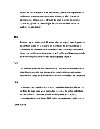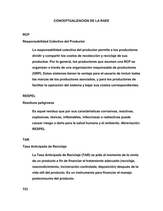 El documento define conceptos clave relacionados con la responsabilidad extendida del productor como la responsabilidad colectiva del productor, residuos peligrosos, tasa anticipada de reciclaje, tarjeta de circuito impreso, tubo de rayos catódicos, Cámara Colombiana de Informática y Telecomunicaciones, pantalla de cristal líquido, y categorías de electrodomésticos como línea blanca, línea gris y línea marrón.